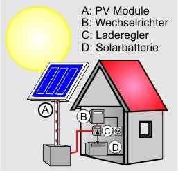Wird der mit einer autark arbeitenden Insel Photovoltaik-Anlage erzeugte Gleichstrom nicht umgehend benötigt, so kann er in einer Solarbatterie zwischengespeichert werden.