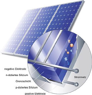 Eine Solarzelle besteht aus zwei Schichten: einer negativ und einer positiv dotierten Lage. Fällt Licht auf die Zelle, entsteht Spannung zwischen den beiden Schichten.